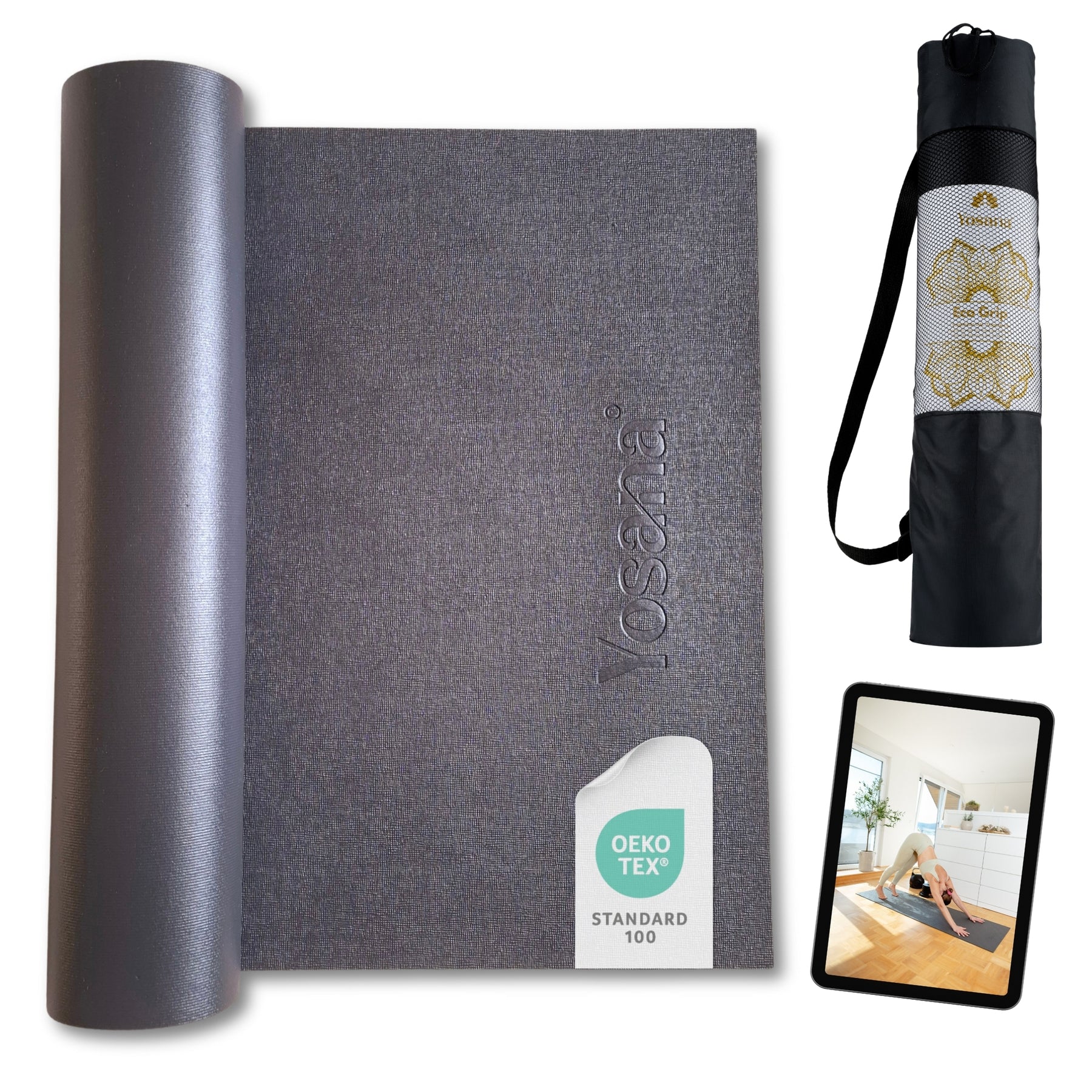 Die Yosana Eco Grip PVC Yoga Matte "Made in Germany" hat einen Recyclinganteil von bis zu 50 %. Mit super Grip und hoher Dämpfung eignet sich diese Yogamatte für alle Arten von Yoga, vom Herabschauenden Hund bis zum Krieger und ist dabei angenehm weich im Stand, isolierend und gelenkschonend, besonders für Yoga Anfänger. Nur ca. 1,50kg und Tragetasche inklusive. In Deutschland mit 100% Grünstrom hergestellt (Made in Green Zertifikat).